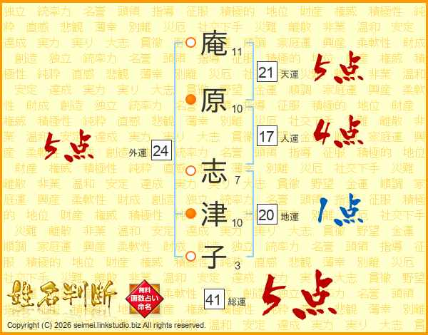 庵(11画)原(10画) 志(7画)津(10画)子(3画)