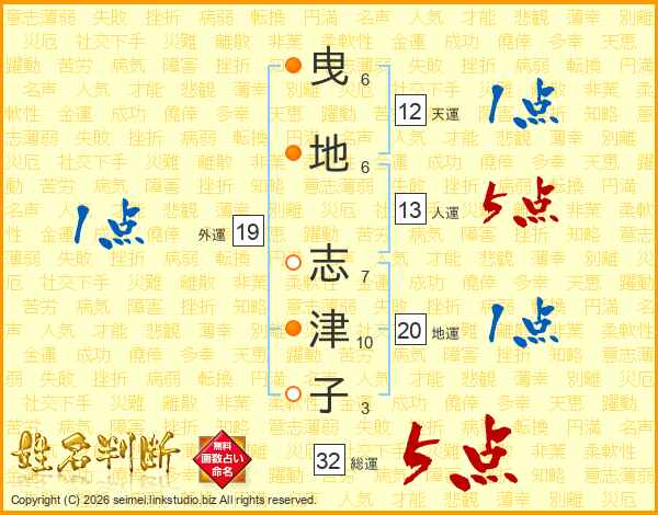 曳地志津子さんの総運は32画の5点!