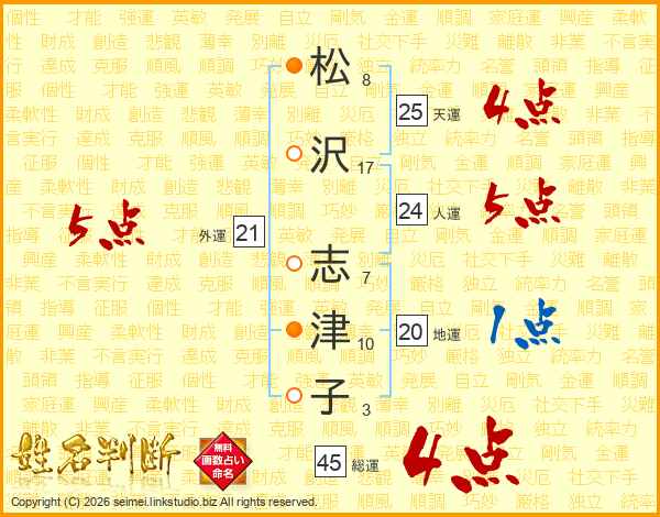 松(8画)沢(17画) 志(7画)津(10画)子(3画)