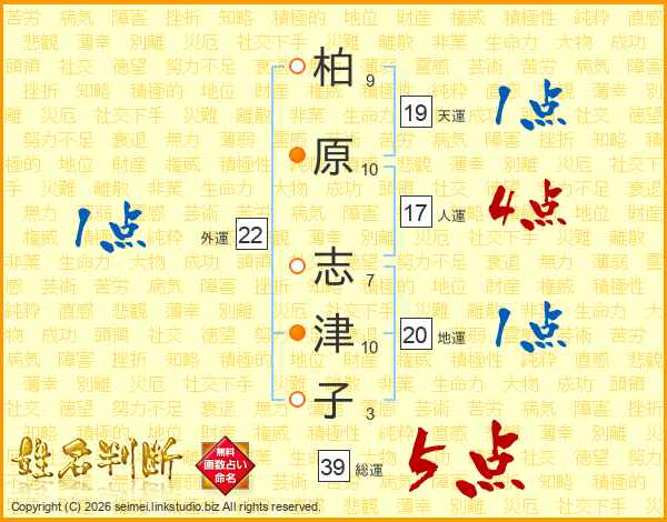 柏原志津子さんの総運は39画の5点!
