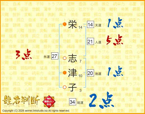 あなたの人生を表す1番重要な運勢です。生涯を通じて影響する総合運となり、主に50歳以降の晩年期に影響を及ぼします。苗字と名前の合計画数。