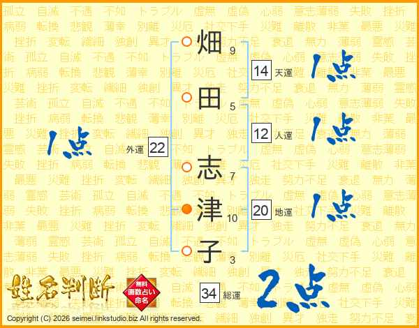 畑(9画)田(5画) 志(7画)津(10画)子(3画)