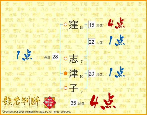 生活面を象徴する運勢です。外部から受ける影響力を表し、結婚運、家庭運や職場、環境への順応性を表します。総運から人運を引いた画数。姓や名が1文字の場合を除く。