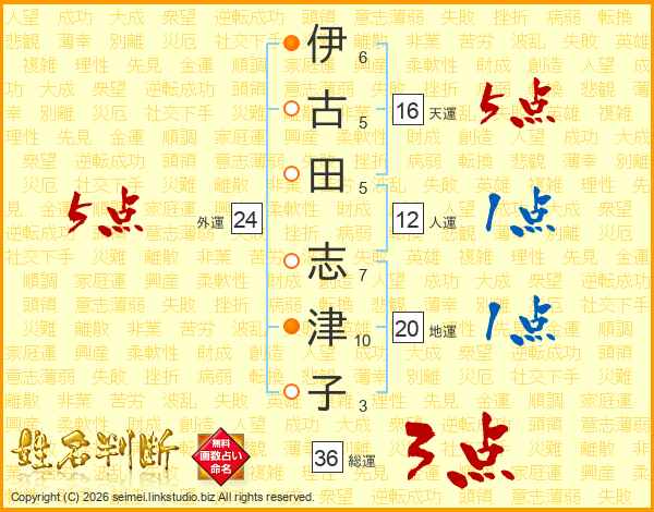 伊(6画)古(5画)田(5画) 志(7画)津(10画)子(3画)