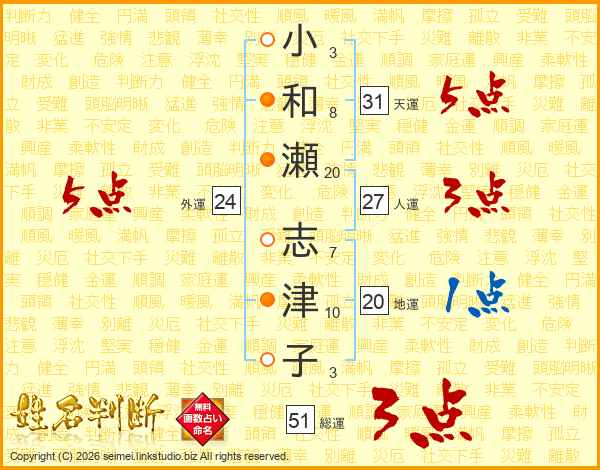 小(3画)和(8画)瀬(20画) 志(7画)津(10画)子(3画)