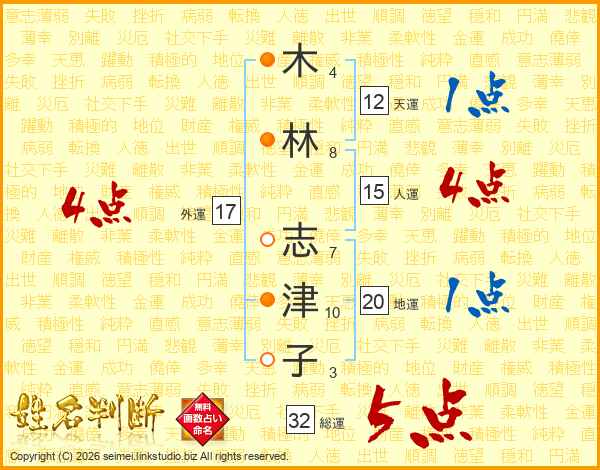 木(4画)林(8画) 志(7画)津(10画)子(3画)