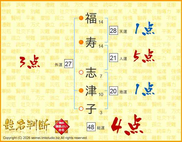 福(14画)寿(14画) 志(7画)津(10画)子(3画)