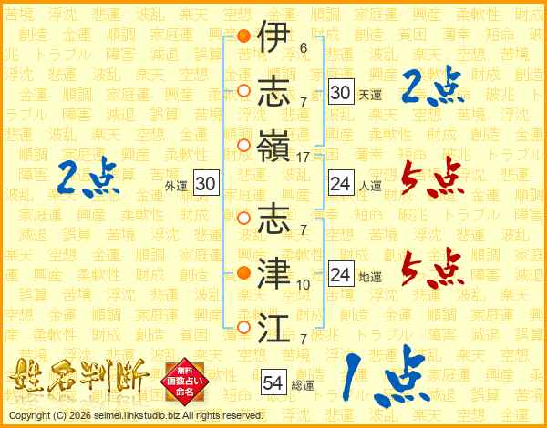 伊(6画)志(7画)嶺(17画) 志(7画)津(10画)江(7画)