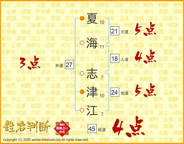 夏(10画)海(11画) 志(7画)津(10画)江(7画)