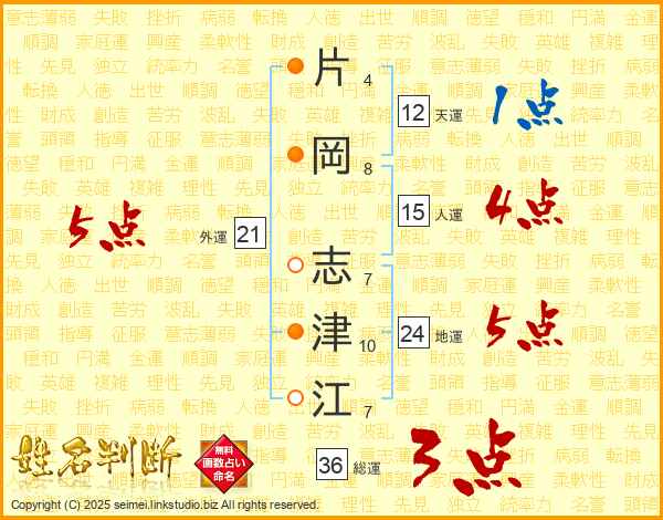 片(4画)岡(8画) 志(7画)津(10画)江(7画)