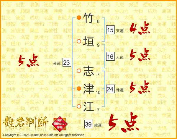 竹(6画)垣(9画) 志(7画)津(10画)江(7画)