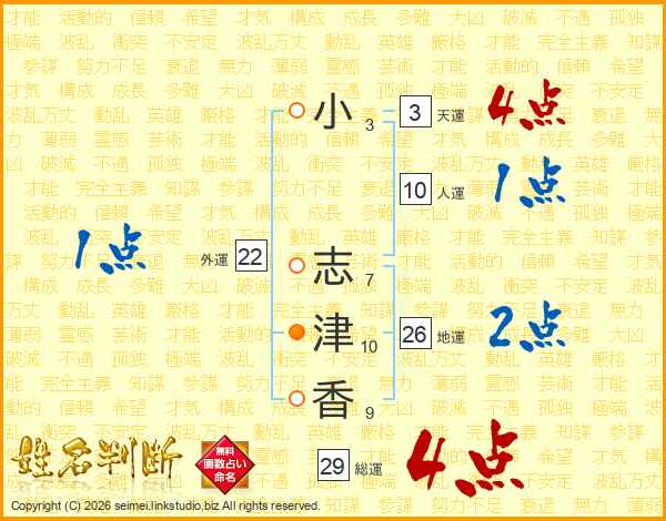 生活面を象徴する運勢です。外部から受ける影響力を表し、結婚運、家庭運や職場、環境への順応性を表します。総運から人運を引いた画数。姓や名が1文字の場合を除く。