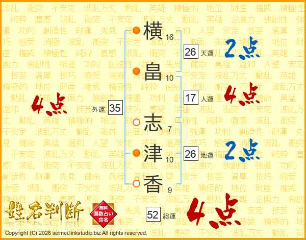 横(16画)畠(10画) 志(7画)津(10画)香(9画)