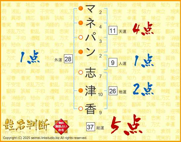 マ(2画)ネ(4画)パ(3画)ン(2画) 志(7画)津(10画)香(9画)