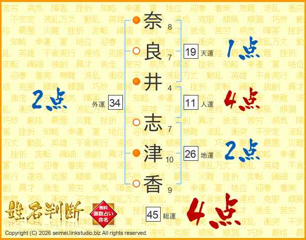 奈(8画)良(7画)井(4画) 志(7画)津(10画)香(9画)