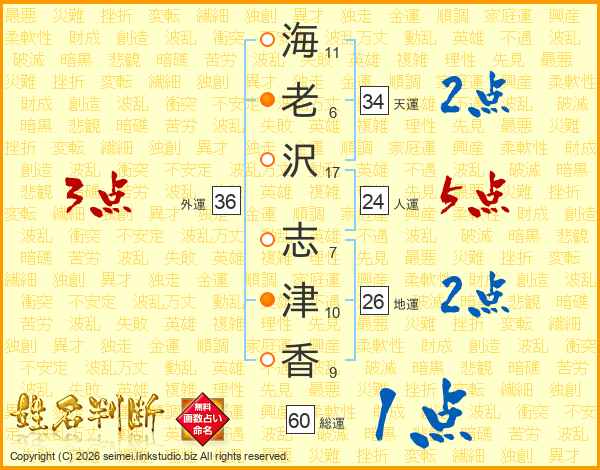 海(11画)老(6画)沢(17画) 志(7画)津(10画)香(9画)
