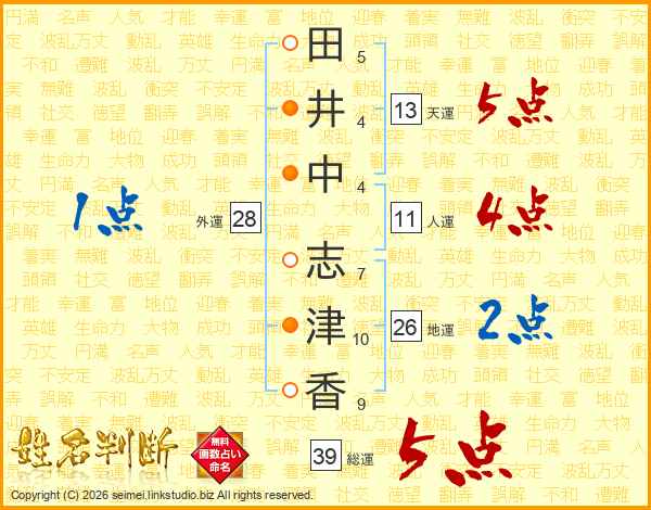 田(5画)井(4画)中(4画) 志(7画)津(10画)香(9画)