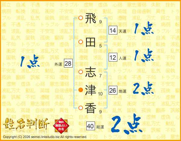 飛(9画)田(5画) 志(7画)津(10画)香(9画)