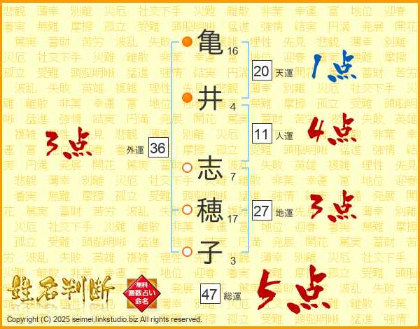 亀(16画)井(4画) 志(7画)穂(17画)子(3画)
