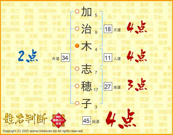 加(5画)治(9画)木(4画) 志(7画)穂(17画)子(3画)