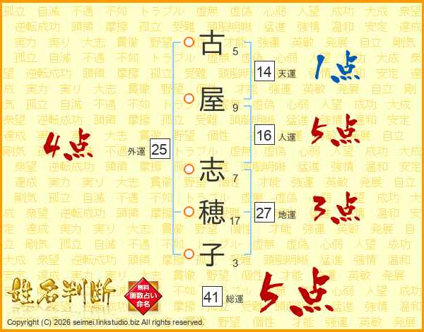 古(5画)屋(9画) 志(7画)穂(17画)子(3画)