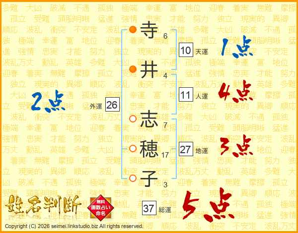 寺(6画)井(4画) 志(7画)穂(17画)子(3画)