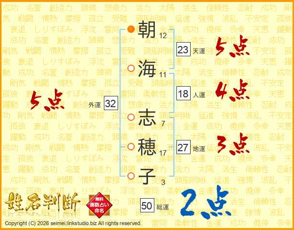 朝(12画)海(11画) 志(7画)穂(17画)子(3画)