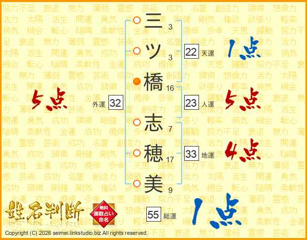 三(3画)ツ(3画)橋(16画) 志(7画)穂(17画)美(9画)