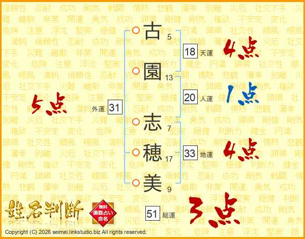 古(5画)園(13画) 志(7画)穂(17画)美(9画)