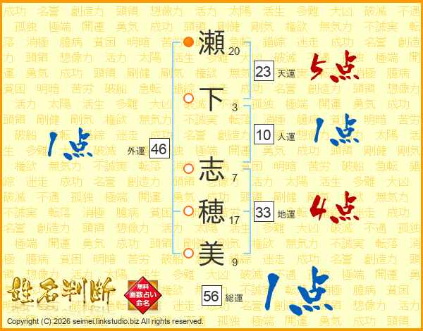 瀬(20画)下(3画) 志(7画)穂(17画)美(9画)
