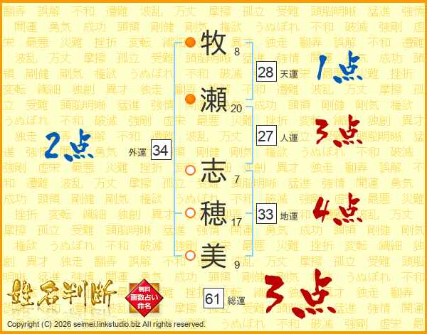 牧(8画)瀬(20画) 志(7画)穂(17画)美(9画)