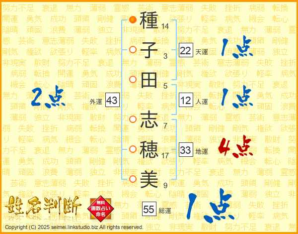 種(14画)子(3画)田(5画) 志(7画)穂(17画)美(9画)