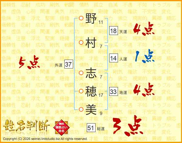 野(11画)村(7画) 志(7画)穂(17画)美(9画)