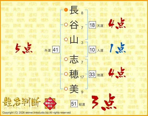長(8画)谷(7画)山(3画) 志(7画)穂(17画)美(9画)