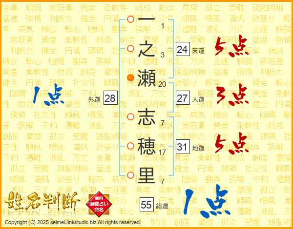 一(1画)之(3画)瀬(20画) 志(7画)穂(17画)里(7画)
