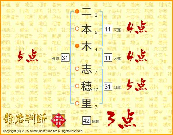 二(2画)本(5画)木(4画) 志(7画)穂(17画)里(7画)