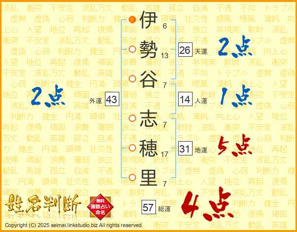 伊(6画)勢(13画)谷(7画) 志(7画)穂(17画)里(7画)
