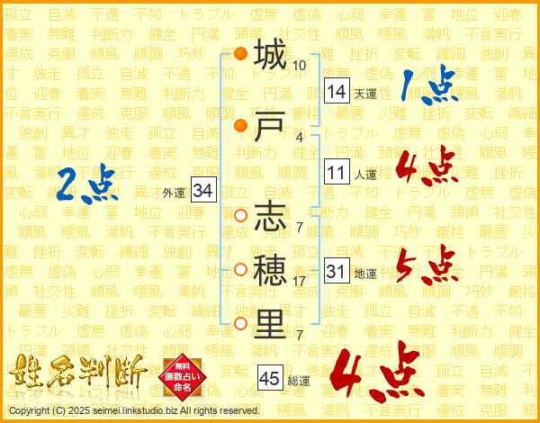 城(10画)戸(4画) 志(7画)穂(17画)里(7画)