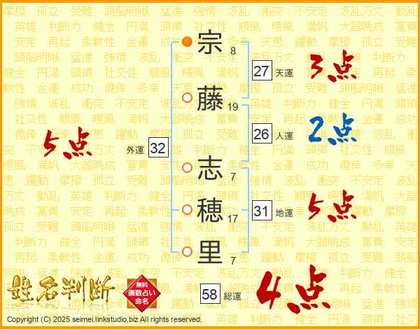 宗(8画)藤(19画) 志(7画)穂(17画)里(7画)