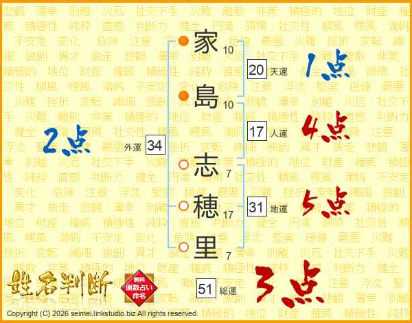 家(10画)島(10画) 志(7画)穂(17画)里(7画)