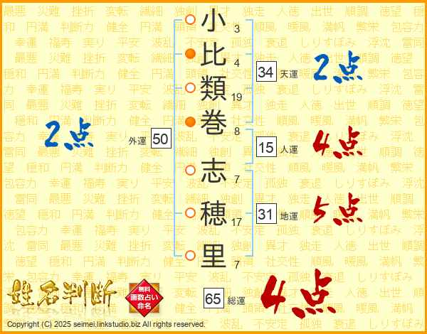 小(3画)比(4画)類(19画)巻(8画) 志(7画)穂(17画)里(7画)