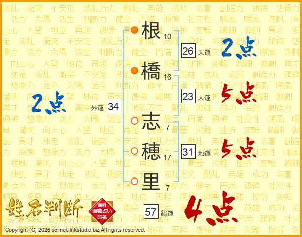 根(10画)橋(16画) 志(7画)穂(17画)里(7画)