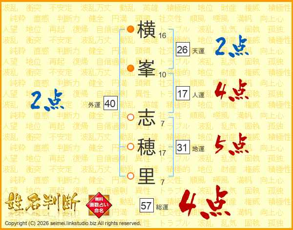 横(16画)峯(10画) 志(7画)穂(17画)里(7画)
