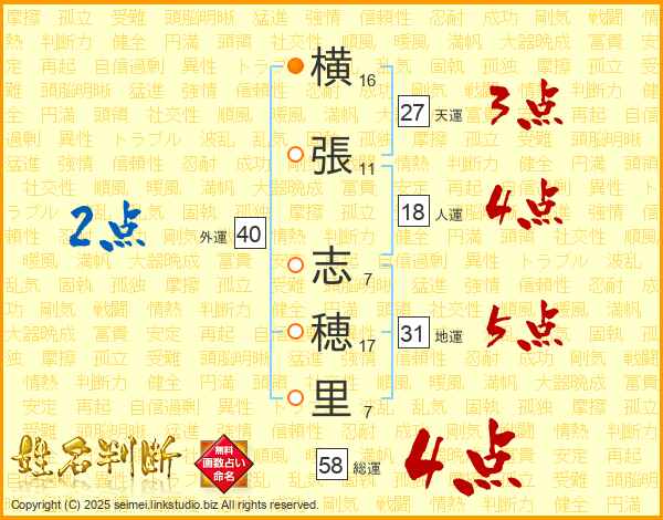 横(16画)張(11画) 志(7画)穂(17画)里(7画)
