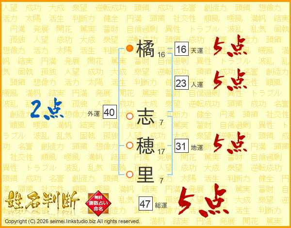 橘(16画) 志(7画)穂(17画)里(7画)