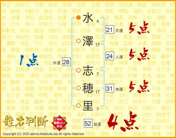 水(4画)澤(17画) 志(7画)穂(17画)里(7画)