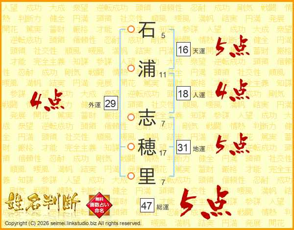 石(5画)浦(11画) 志(7画)穂(17画)里(7画)