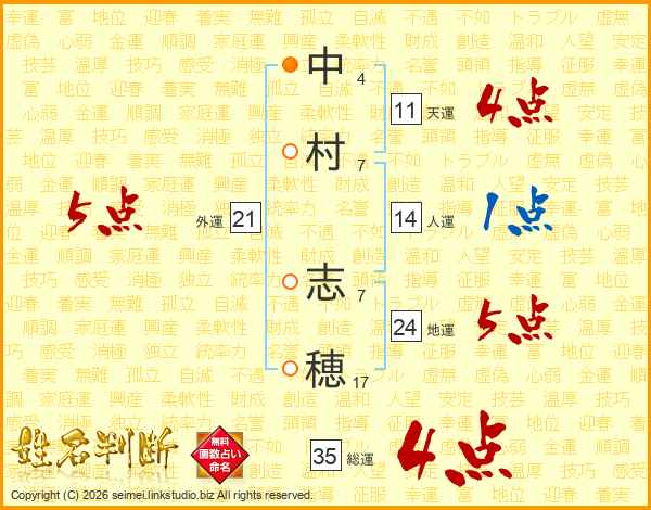 中(4画)村(7画) 志(7画)穂(17画)