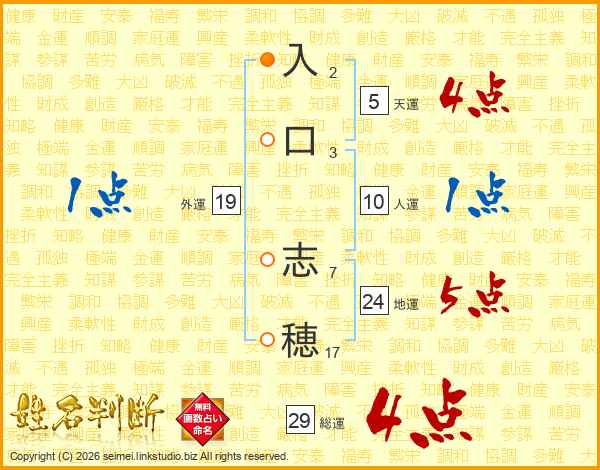 生活面を象徴する運勢です。外部から受ける影響力を表し、結婚運、家庭運や職場、環境への順応性を表します。総運から人運を引いた画数。姓や名が1文字の場合を除く。