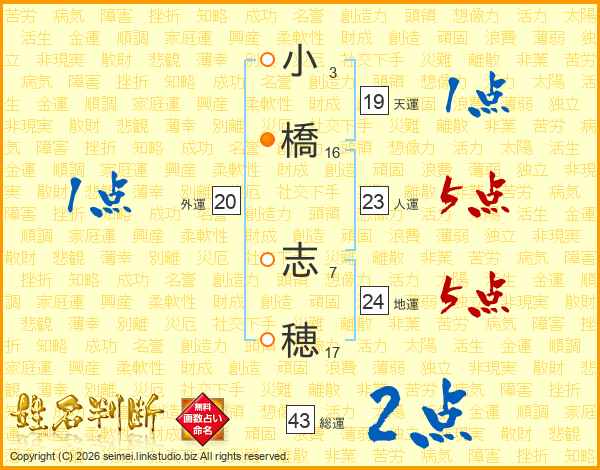 あなたの人生を表す1番重要な運勢です。生涯を通じて影響する総合運となり、主に50歳以降の晩年期に影響を及ぼします。苗字と名前の合計画数。